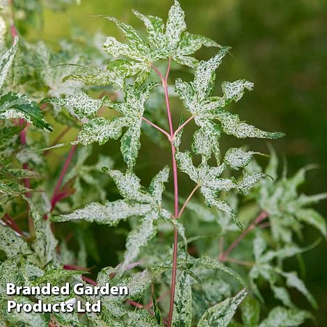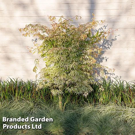 This striking Acer has been given the poetic name ‘Floating Cloud Maple’ due to its unusual, variegated foliage. Each leaf bears a unique pattern of pale green sprinkles against a cream background with a blush of pink spreading from the tips. Some leaves emerge completely cream whilst others are more speckled and their colours evolve during the growing season. The overall effect is stunning – forming a tree with a pale, floaty appearance – it’s especially striking set against a background of darker foliage. In autumn, the foliage develops rich yellow-orange tones before falling to unveil an elegant tracery of fine, tiered branches. Acers are slow growing and make ideal specimens for small gardens and containers where they provide multiple seasons of interest. Height and Spread: 250cm (98in).