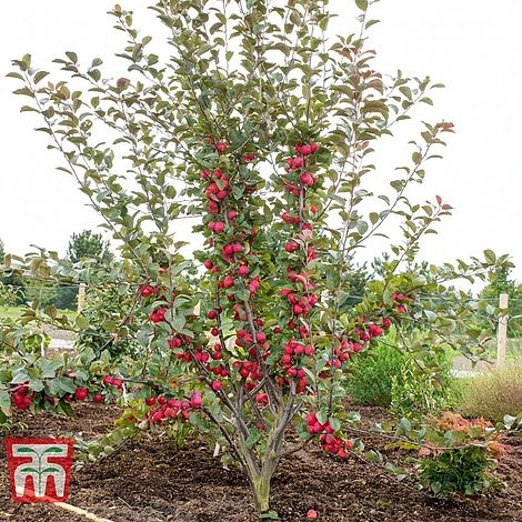 Everything about this tree is in miniature – except the size of the crop! Apple ‘Appeltini’ is a compact new variety reaching just 2m tall with maturity, making it perfect for a large pot on the patio! Its pretty pink blossom makes an attractive feature in spring, followed by a plentiful crop of tiny, golf-ball sized apples. The fruits have purple skins that ripen to glossy, rosy red with a lovely sweet flavour. These bite-sized fruits have plenty of appeal for kids’ lunch boxes and make excellent toffee apples too. Fruits can be harvested from August to November. Height and spread: 2m (6′).