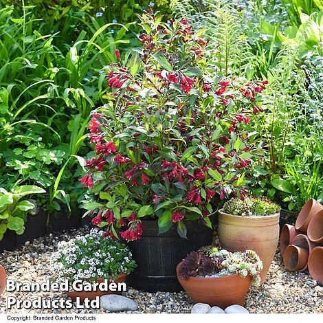 A stunning new Weigela launched at Chelsea Plant of Year 2023, ‘Camouflage’ is the first to pair deep red flowers with variegated green/purple foliage. Generous clusters of trumpet-like, ruby-red flowers are set against foliage splashed bright green with purple-bronze margins. The whole effect is vibrant but harmonious, the flowers toning beautifully with the purple tints, whilst the lime splashes create contrasting highlights. Compact and densely branching, Weigela ‘Camouflage’ is a reliable and rewarding shrub for mixed borders and containers in sun or partial shade, providing a long season of foliage interest as well as colourful flowers. Height and spread: 60cm (24in).